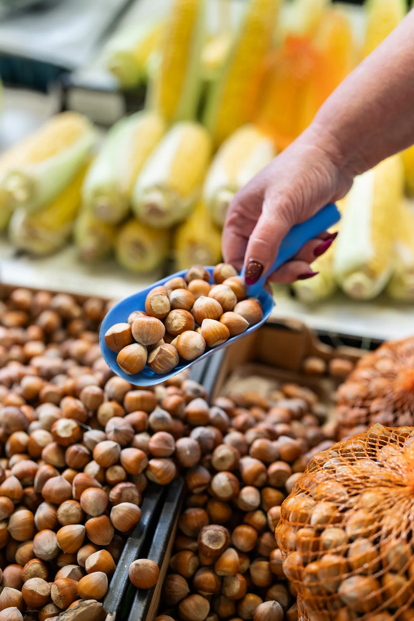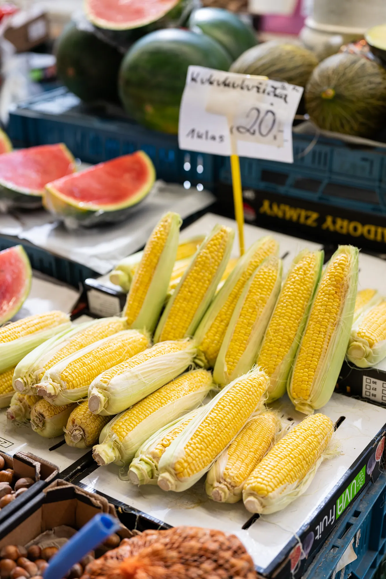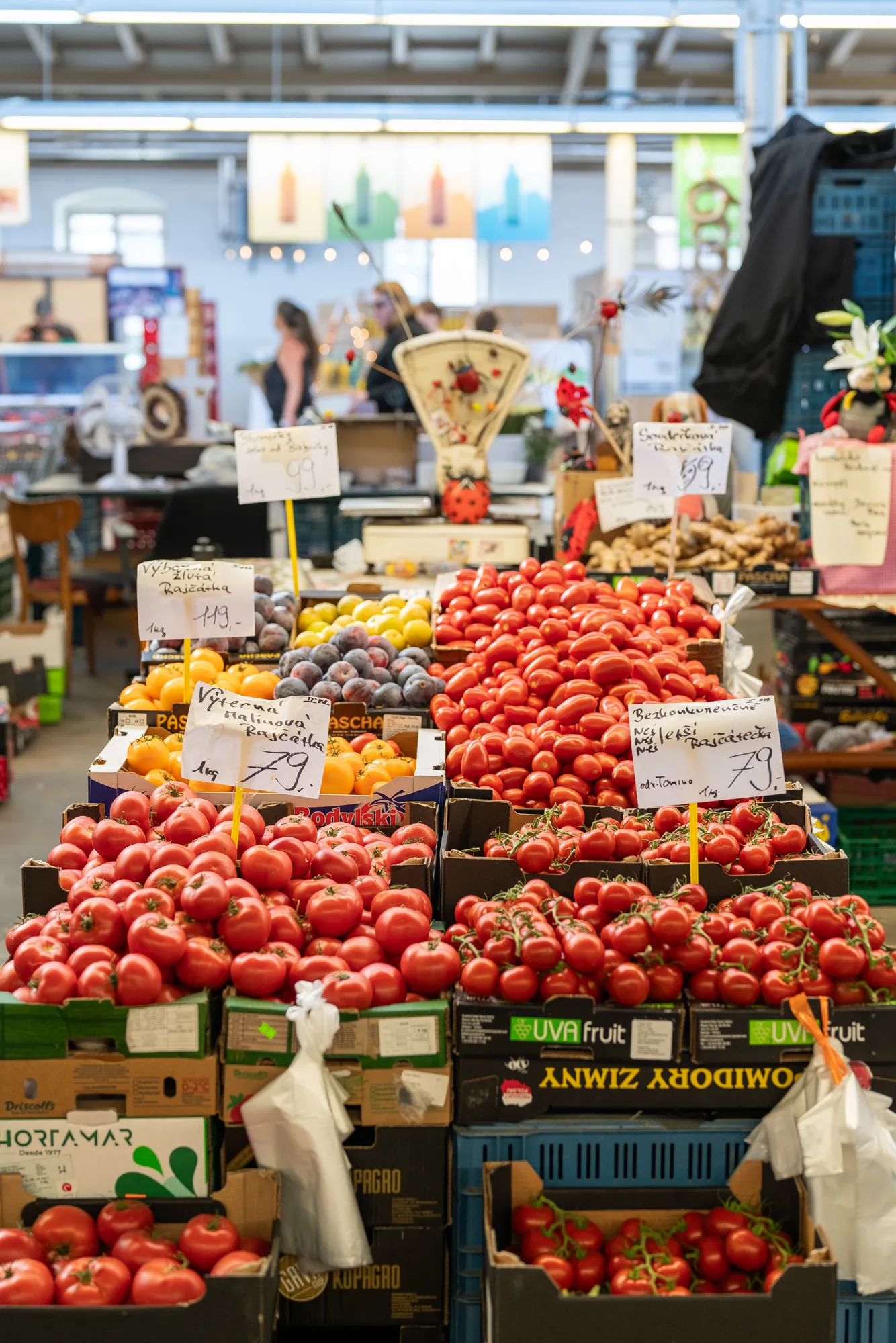 Celoroční nabídka ovoce a zeleniny z dovozu. Lokální med.