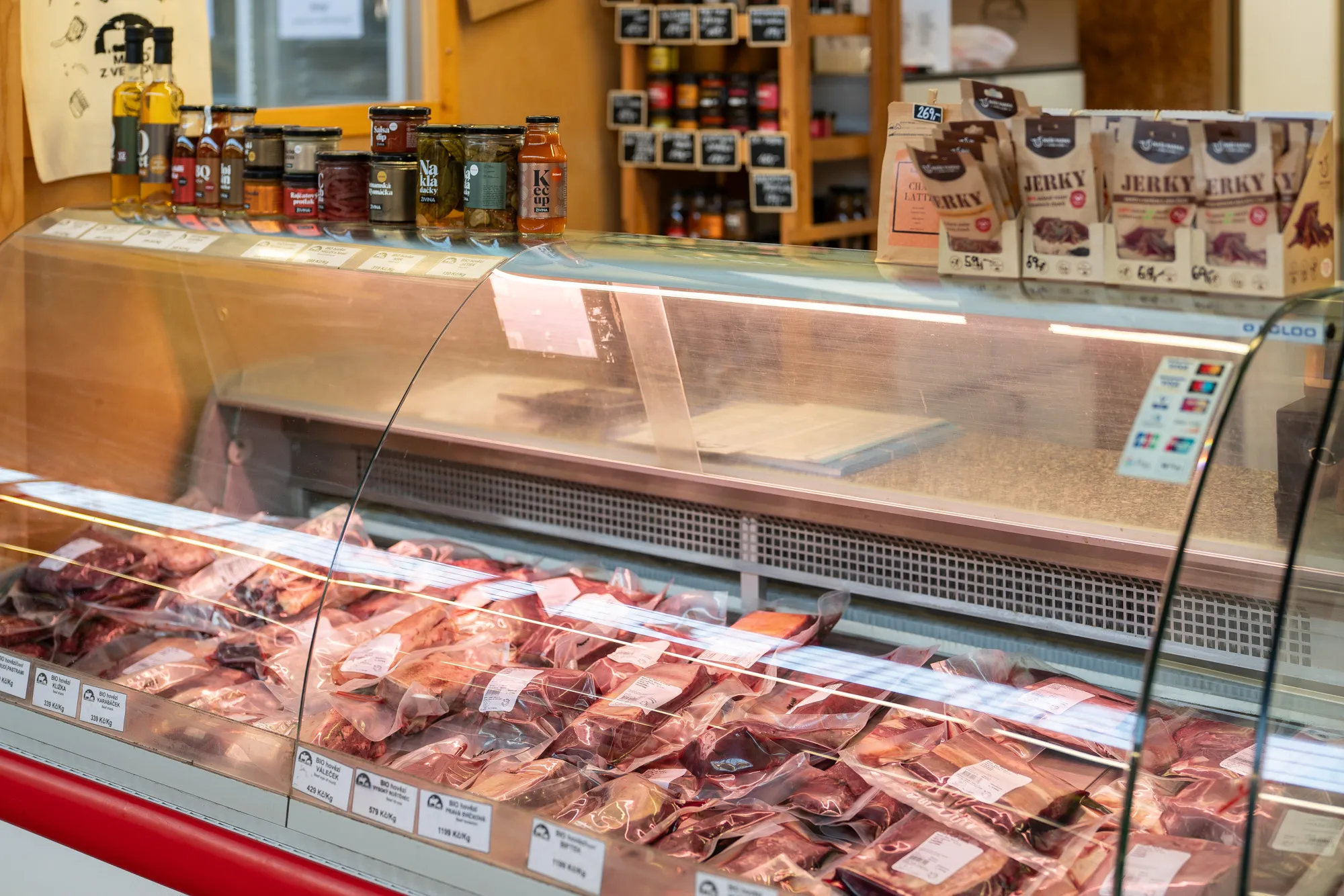 Hovězí, farmářské vepřové, bio jehněčí, zvěřina i pštros, bio mléčné výrobky a omáčky od Živiny.